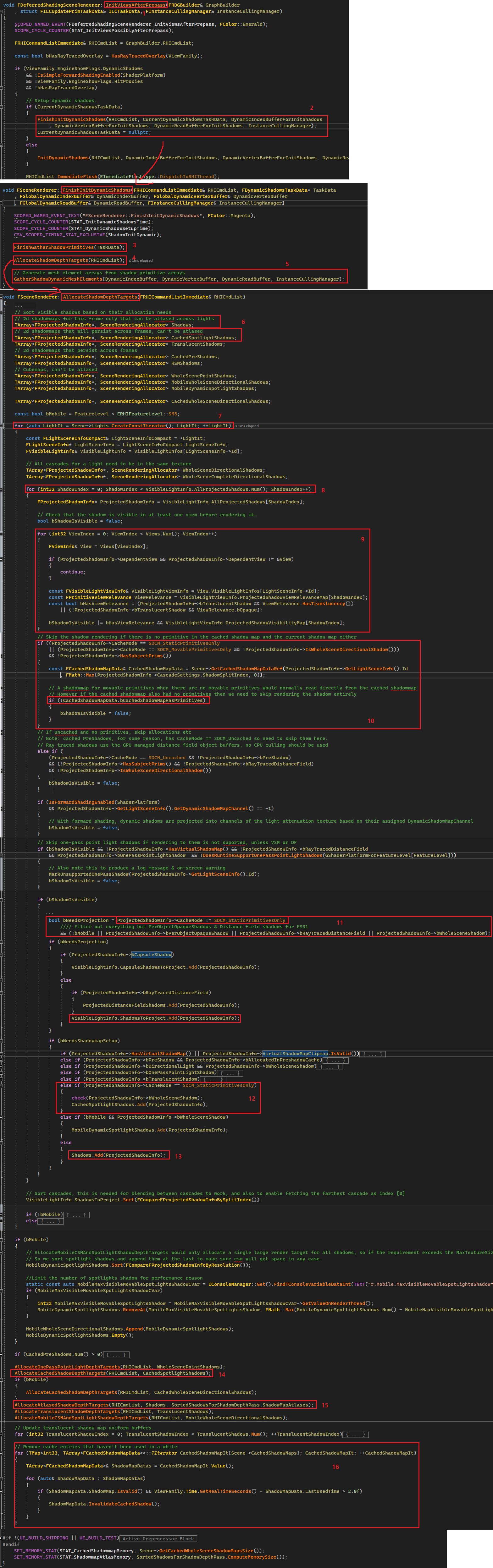 InitViewsAfterPrepass 에서 실행되는 FinishInitDynamicShadows 를 살펴봅시다. FinishGatherShadowPrimitives 는 CSM 쉐도우에서만 사용하므로 무시합니다.