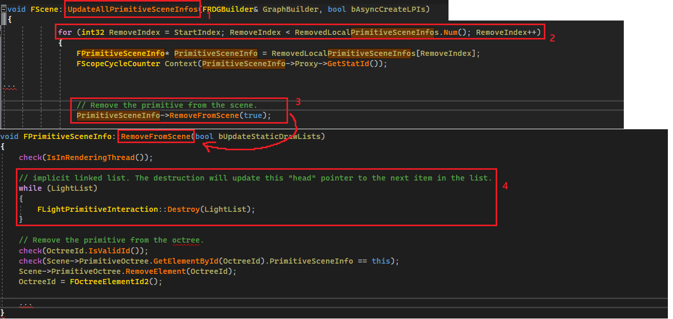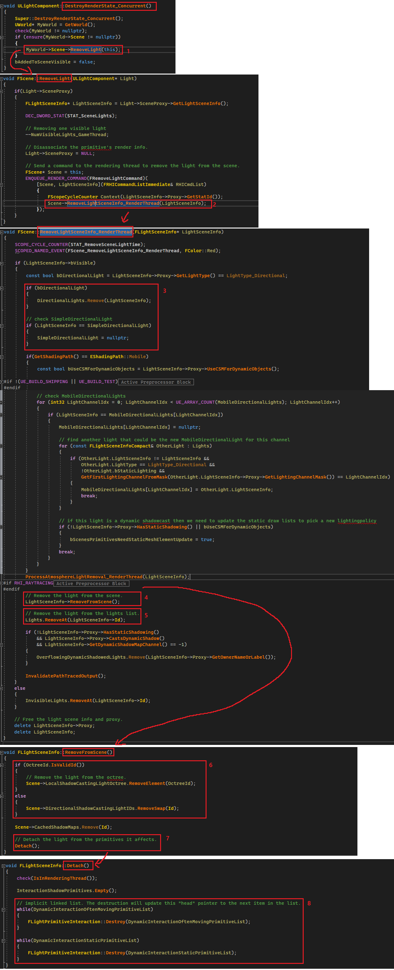 3. DestroyRenderState_Concurrent : 렌더스레드에서 미러링된 라이트를 제거합니다. RemoveLight 함수로 FScene에서 제거합니다.