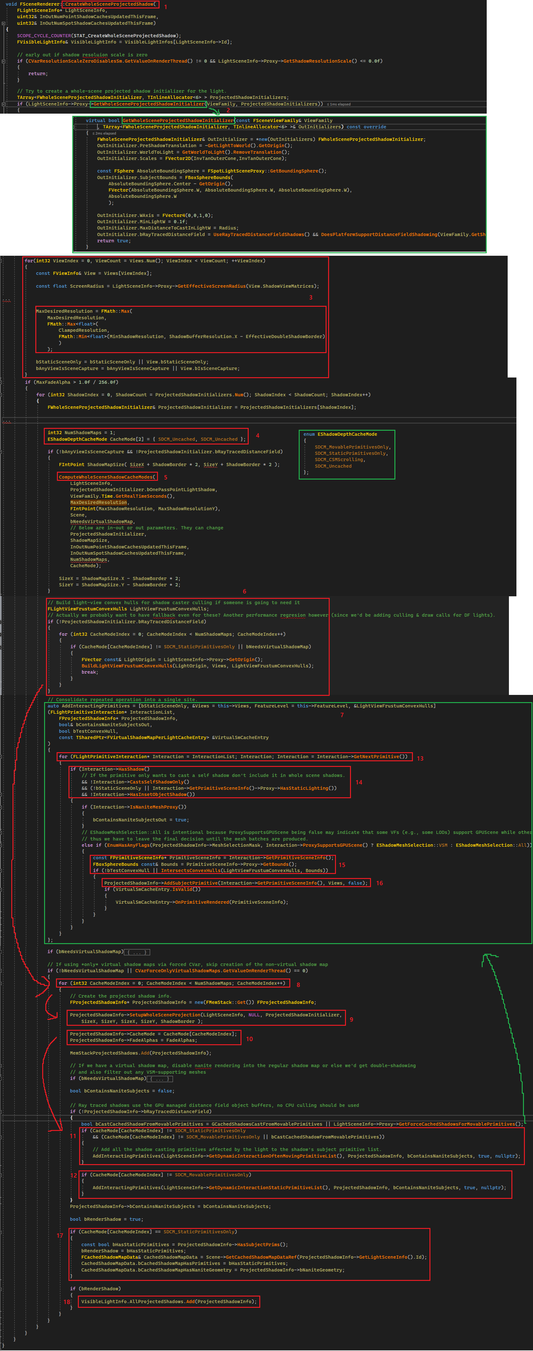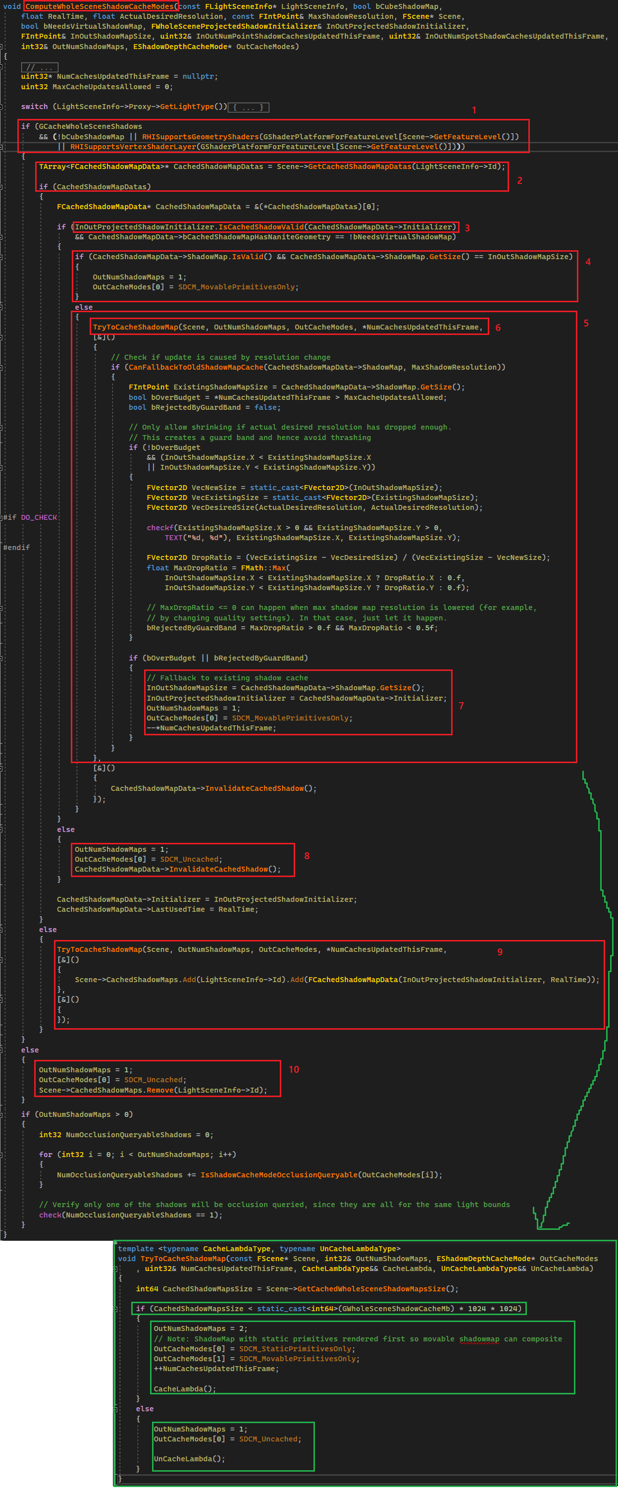 6. TryToCacheShadowMap을 호출해줘서 새로 Static 프리미티브들을 렌더링 한 쉐도우맵을 캐싱합니다. 초록색 선을 따라서 함수 구현을 보면 캐시 할 쉐도우맵의 크기가 예산 내에 들어오면 CacheModes[0] 에 Static 프리미티브를 렌더링 하여 캐싱할 수 있는 SDCM_StaticPrimitivesOnly 로 설정하고, CacheMode[1] 에는 Dynamic 프리미티브를 렌더링 하는 SDCM_MovablePrimitivesOnly 를 설정합니다. 이때 이 순서도 반드시 SDCM_StaticPrimitivesOnly -> SDCM_MovablePrimitivesOnly 순서로 돼야 하는데, SDCM_MovablePrimitivesOnly의 경우 캐시 된 쉐도우맵을 복사해오는 패스가 추가되기 때문에 SDCM_StaticPrimitivesOnly를 먼저 그려줘야 Static, Dynamic 프리미티브 모두를 렌더링 할 수 있습니다. 만약 캐시된 쉐도우맵을 사용하기에 예산이 충분하지 않다면 캐시 하지 않도록 합니다.