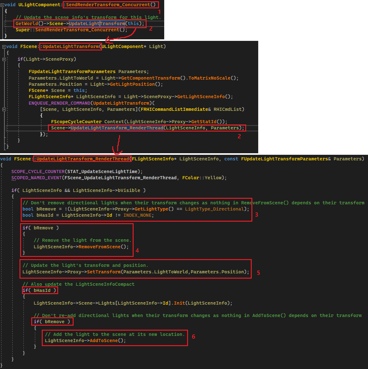 2. SendRenderTransform_Concurrent : 렌더스레드에 Light의 Transform을 업데이트합니다. UpdateLightTransform 함수로 FScene에 반영합니다.