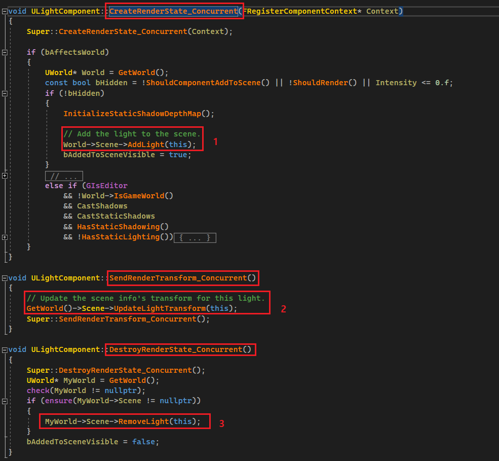 1. CreateRenderState_Concurrent : 렌더스레드에 LightComponent를 미러링 합니다. AddLight 함수로 FScene에 등록합니다.