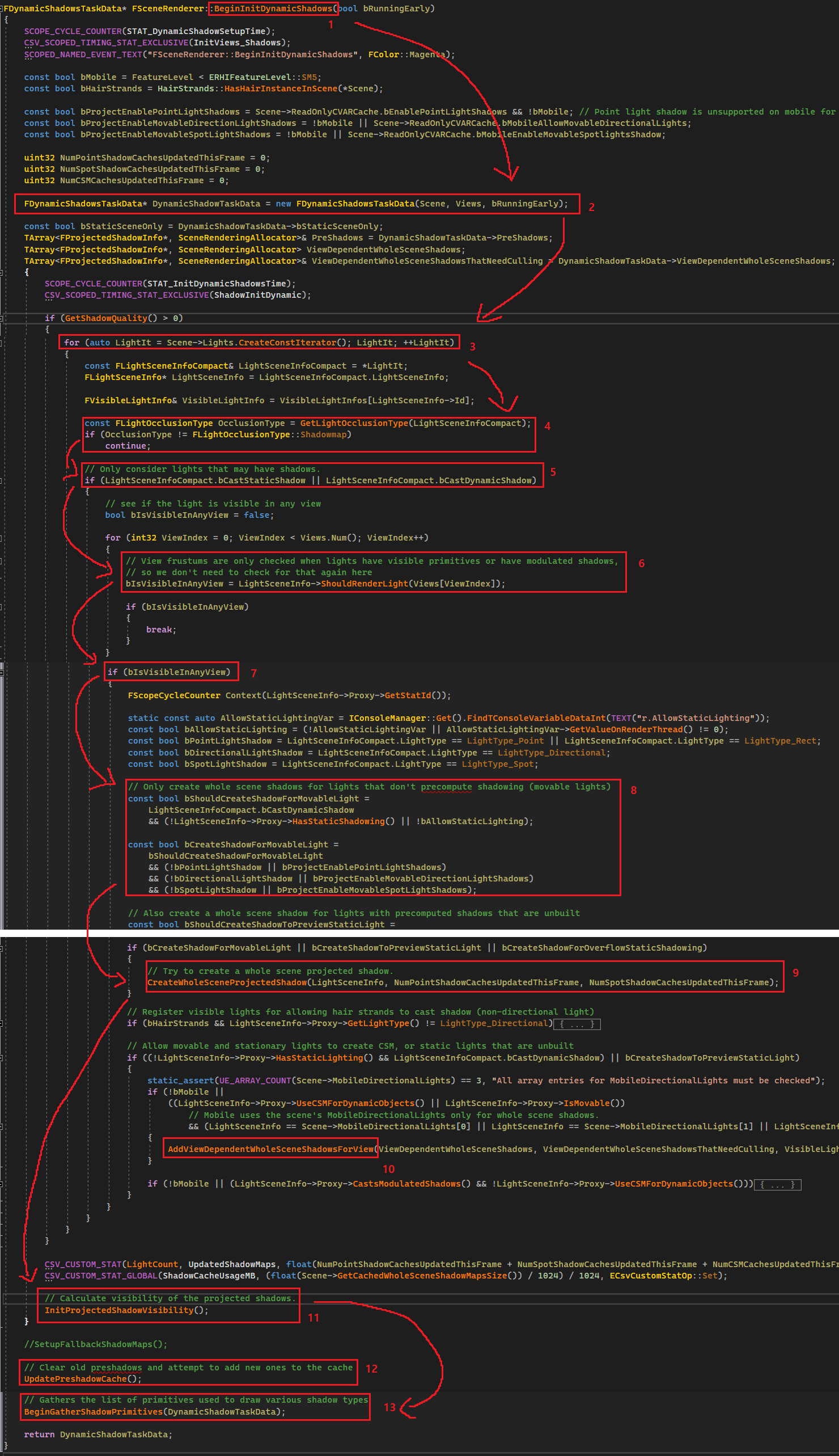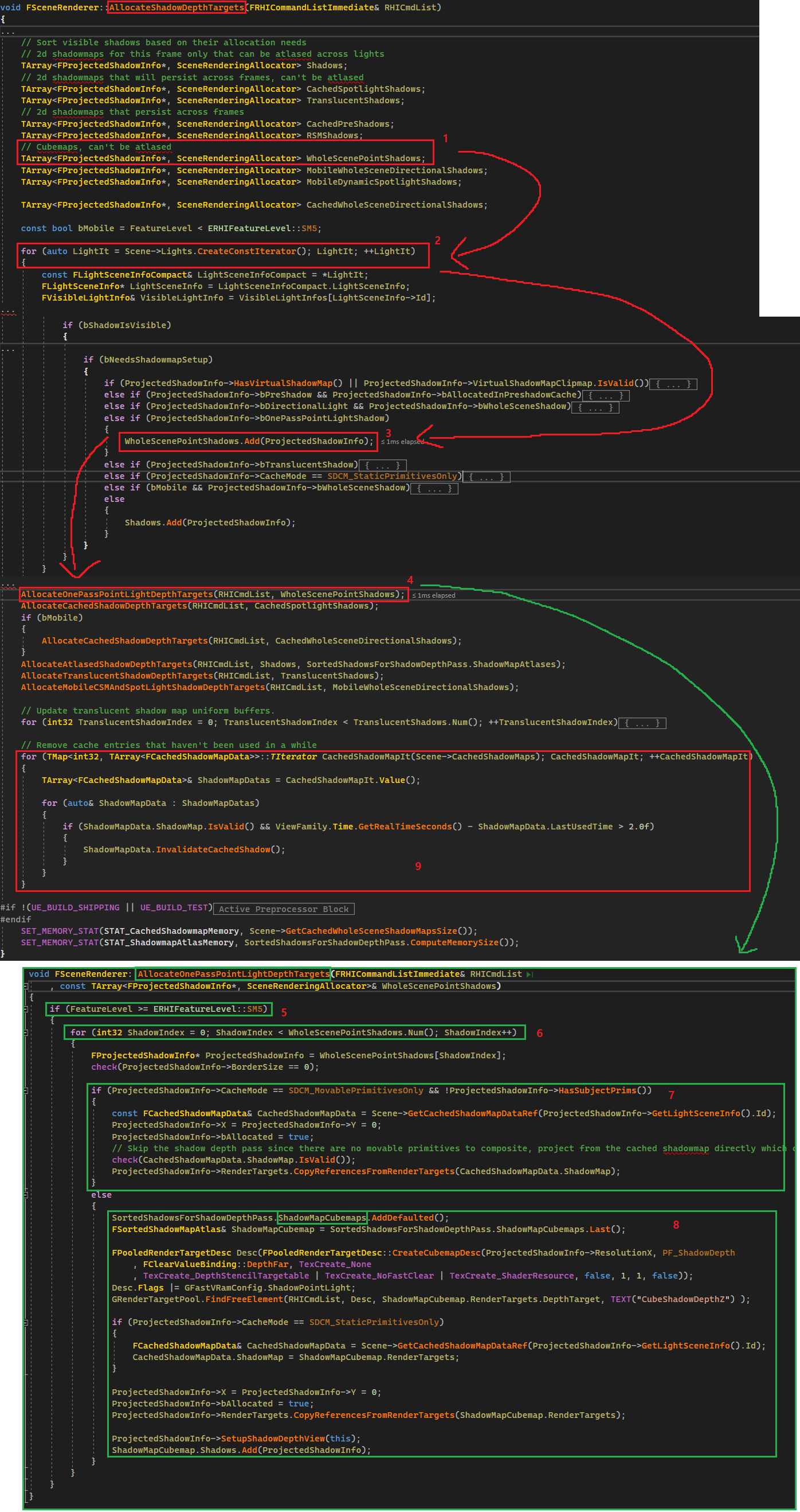 16. 여기서는 캐시 된 쉐도우맵이 사용된지 오래되었다면, 쉐도우맵 렌더타겟을 릴리즈 해줍니다. 캐시 된 쉐도우맵의 ShadowMapData.LastUsedTime 갱신은 ComputeWholeSceneShadowCacheModes 함수에서 합니다. ComputeWholeSceneShadowCacheModes가 수행되려면 라이트가 뷰프러스텀 내로 들어와서 쉐도우맵을 렌더링해야 되는 경우입니다. 이 부분은 InitViewsBeforePrepass -> BeginDynamicShadows 에서 bIsVisibleInAnyView 가 true 인지 여부를 확인하며 코드는 그림9의 7번을 참고해주세요.