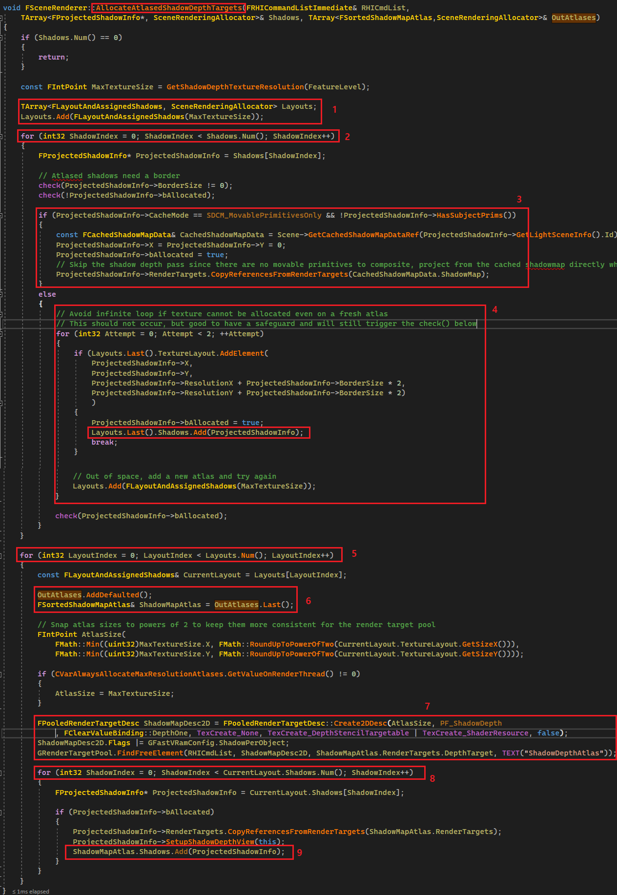 15. AllocateAtlasedShadowDepthTargets은 이번 프레임에 사용할 쉐도우맵에 대해서 실행됩니다. 그림14에서 함수 내부를 보겠습니다.
