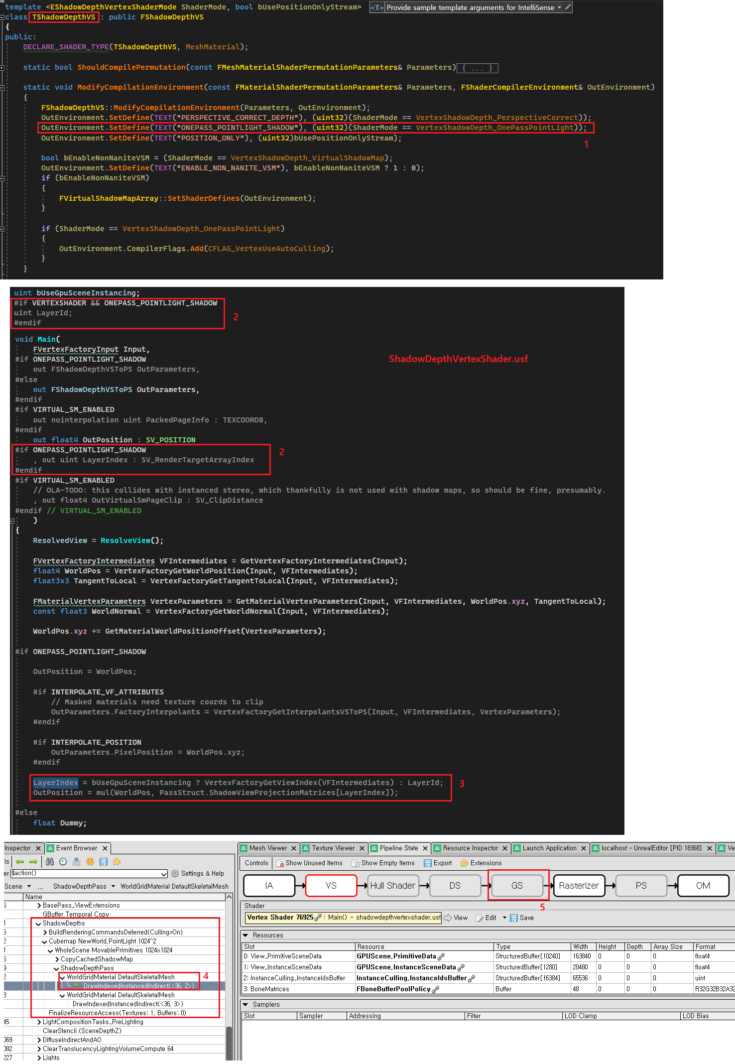 2. 실제 쉐이더를 보면 ONEPASS_POINTLIGHT_SHADOW 의 경우, LayerId와 버택스 쉐이더의 출력으로 uint LayerIndex : SV_RenderTargetArrayIndex(레퍼런스7 참고)를 전달하도록 합니다. 이 LayerIndex 는 Array 타입인 RenderTarget(CubeMap 포함)의 어느 위치에 기록할 것인지를 결정합니다. 최대 6면을 동시에 렌더링 할 수 있어야 하는데, 이런 부분은 인스턴싱을 사용하여 처리합니다. 인스턴싱 데이터는 3 번과정에서 볼 ViewIndex 정보에 담겨있으면서 이 부분을 통해 LayerIndex 를 변경시켜 여러개의 Face 에 동시에 렌더링 합니다.