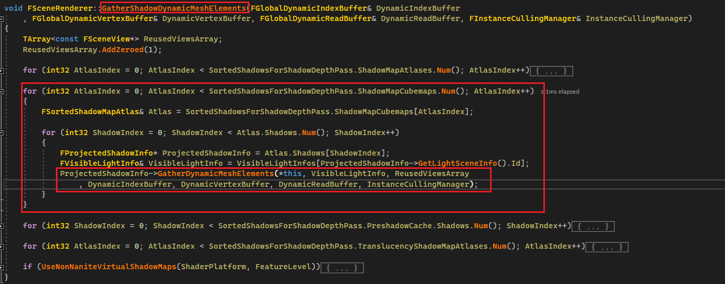 5. 이전 과정에서 만들어둔 SortedShadowsForShadowDepthPass.ShadowMapAtlases 를 순회합니다. 이 배열에는 FProjectedShadowInfo와 그에 대응하는 렌더타겟이 서로 짝지어 있습니다.