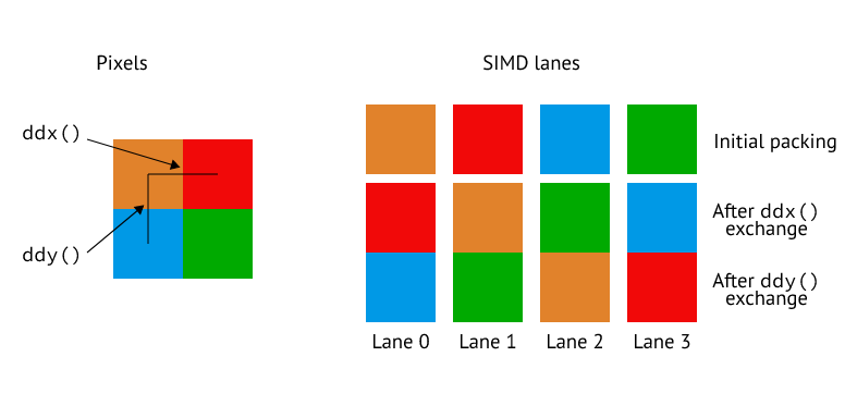 scalar unit 에 관해서는 이 정도로 하고, vector unit 으로 넘어갑시다, 왜냐하면 여기는 굉장히 재미있기 때문입니다. pixel shader 는 연산에 아주 큰 영향을 미칩니다, 왜냐하면 하드웨어가 정말 파격적인 것을 하도록 강요하기 때문입니다 - lane 이 서로 통신하도록 하는 것 같은. 우리가 지금까지 GPU 에 관해 배운 모든 것은 LDS 또는 scalar register 를 통해 무언가를 브로드케스팅하여 (또는 single lane 을 읽어서) 통신하는 것 말고는 lane 들 끼리 서로 통신할 수 없을 거라고 합니다. pixel shader 는 아주 특수한 요구사항 있습니다 - 그것은 derivatives 입니다. GPU 는 derivative 를 quad 를 사용하여 구현합니다, 즉. 2x2 pixel, 그리고 그들 간의 데이터를 dynamic varying 방식으로 교환합니다. 충격인가요?