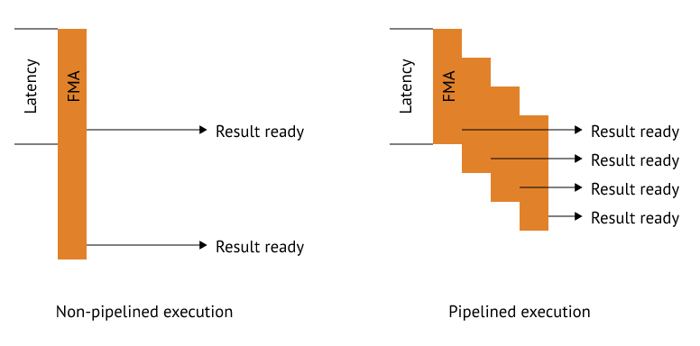 이것은 만약 당신이 single SIMD 에 대해서 수행할 작업이 충분하다면, 우리는 cycle 당 16 FMA 실행된 명령을 얻을 수 있다는 의미입니다. 만약 우리가 매 cycle 마다 다른 명령을 제출할 수 있다면, 몇몇 작업이 완료되지 않는 것 같은 다른 문제를 다뤄야 합니다. 우리의 architecture 가 모든 명령을 4 cycle 지연 처리하고 single-cycle dispatch(매 cycle 마다 새로운 명령을 파이프라인에 추가 할 수 있다는 의미)를 한다고 합시다. 이제, 우리는 이 가상 코드를 실행하는 것을 원합니다: